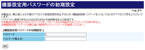 「機器設定用パスワードの初期設定」画面が表示されますので、「パスワード」、「パスワード再入力」欄にご自身が決定した任意の文字列を入力し、[設定]をクリックします。