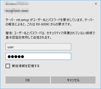 2回目以降のログイン時は、ユーザー名に「user」を、パスワードに「機器設定用パスワード」を入力し、 [OK]をクリックします。 |