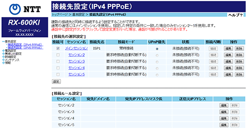 「Web設定」の「トップページ」が表示されますので、左側の「基本設定」の「接続先設定(IPv4 PPPoE)」をクリックし、右側の「接続先の選択設定」の「メインセッション」にチェックを入れ、その「セッション名」または「編集」をクリックすると「接続先設定(メインセッション)」の画面が表示されます。 |
