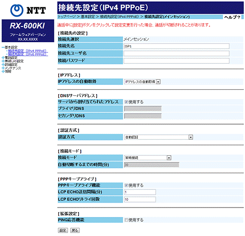 「接続先設定(メインセッション)」の画面で、インターネット接続の設定を行います。 |