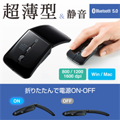 - 左ボタン、右ボタンに静音スイッチを採用しており、公共の場や会議中の操作などでの使用に便利で、折りたたんで電源のON・OFFができます。