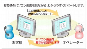 リモートサポートとは、BIOSのサポートスタッフがインターネットを介してお客さまのパソコン画面を遠隔操作して、トラブルの解決をおこなうサービスです。(リモートサポートするBIOS側から見れば、目の前にパソコンの画面があるのと同じ状態なので、原因の追及から解決までが非常にスムーズに進みます。) |