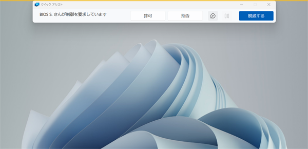 「クイック アシスト」画面上部の をクリックすると、遠隔操作を一時停止します。